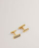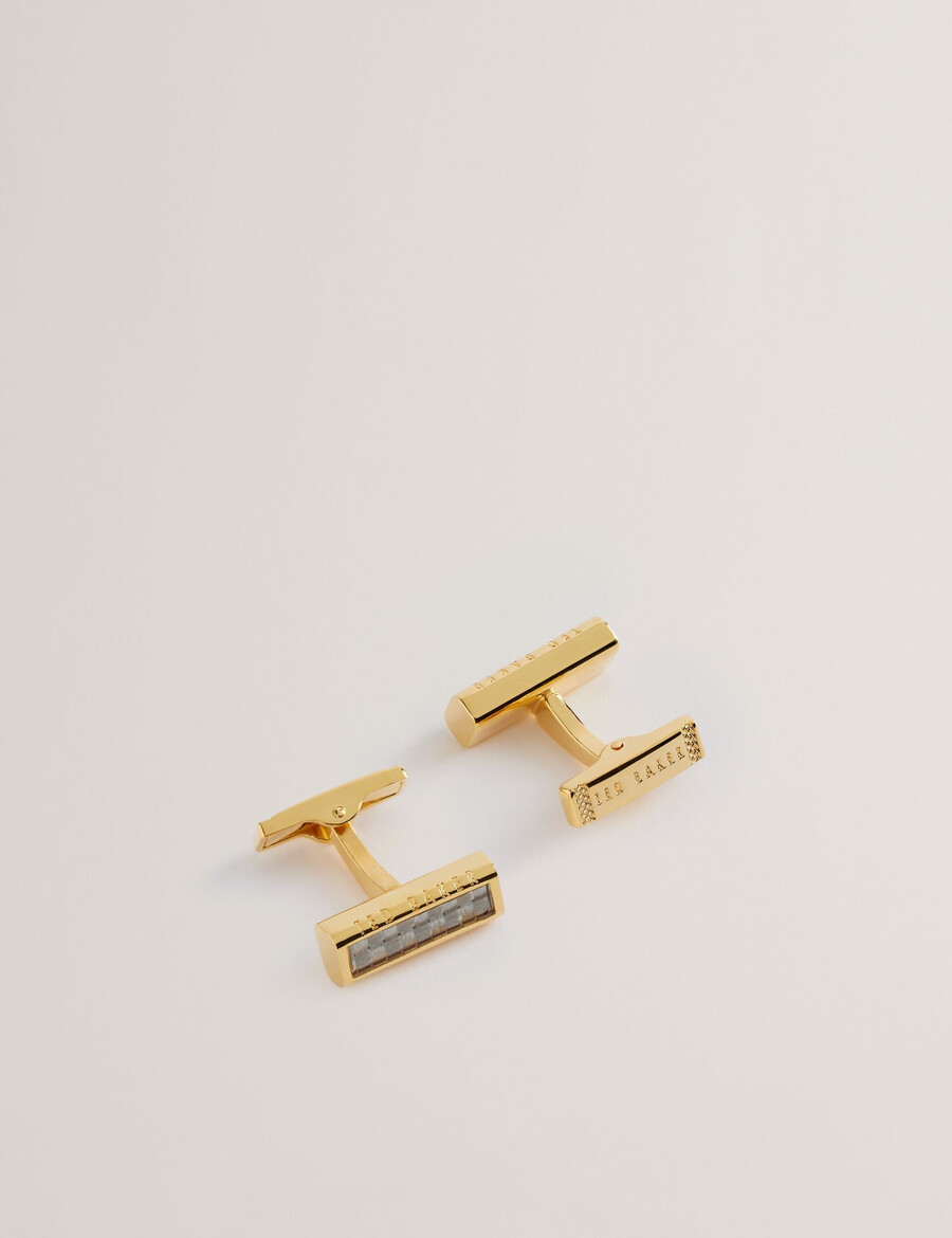 Gemelos de metal Forma de barra larga Centro de fibra de carbono Baño en tono dorado brillante Logotipo grabado Cierre con bisagras 83 % latón, 10 % aleación de zinc, 3 % acero inoxidable, 2 % fibra de carbono, 1 % epoxi, 1 % baño en color dorado No lavar, planchar ni limpiar en seco