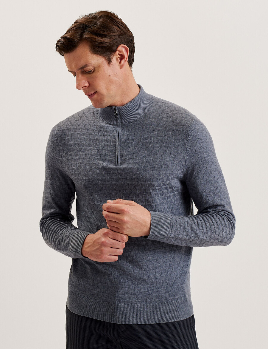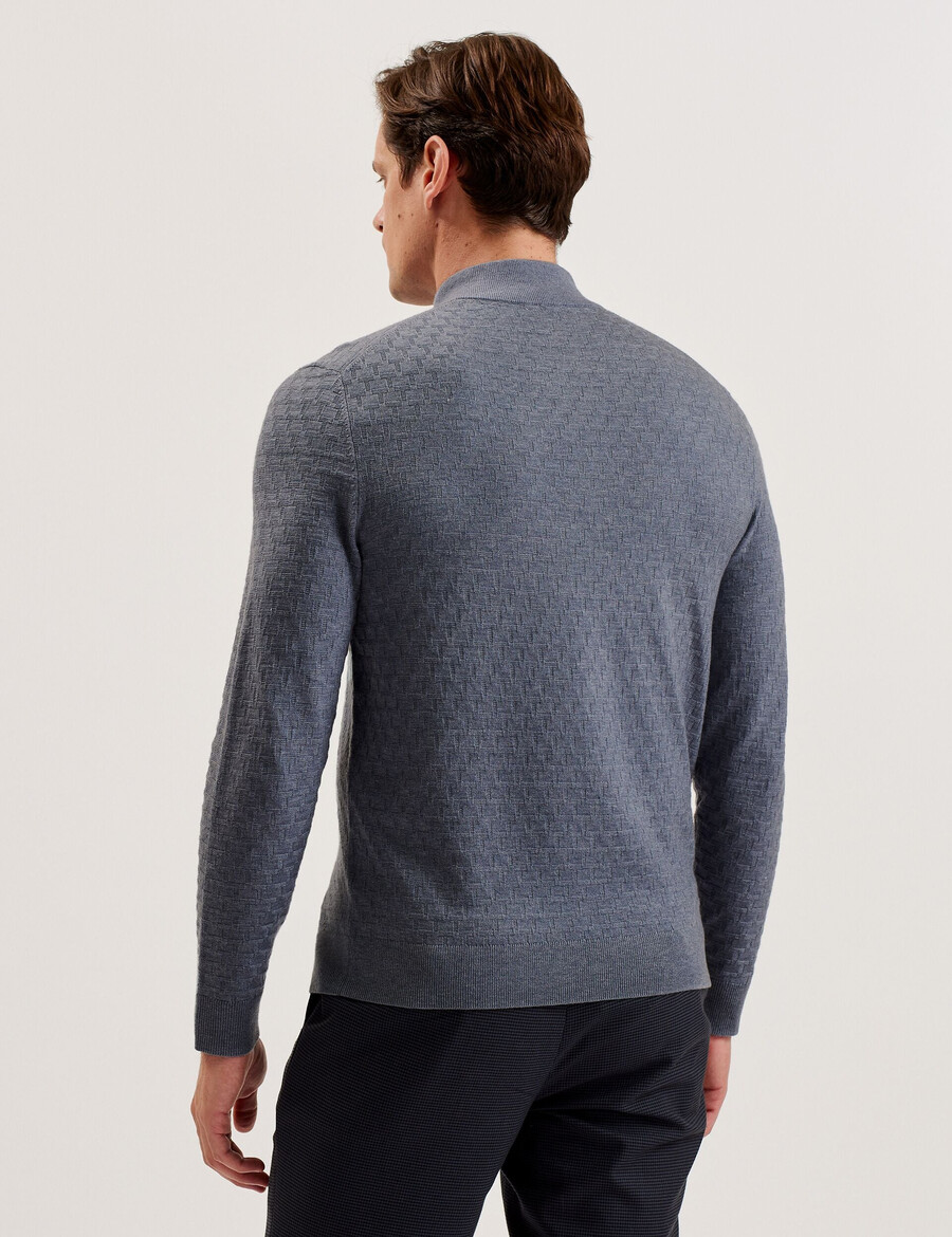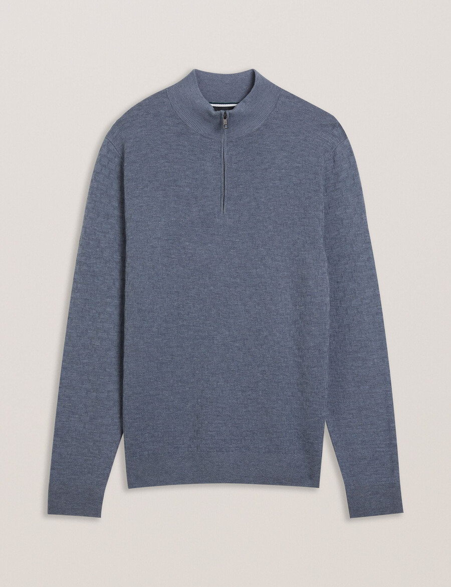 Jersey de manga larga Mezcla de lana Tejido de punto texturizado Cierre de media cremallera Cuello alto Acabados acanalados Lewis mide 1,88 m y lleva Mid Blue en una talla 3 de Ted 32 % poliéster, 31 % poliamida, 28 % acrílico, 7 % lana, 2 % elastano Lavar a mano, se puede limpiar en seco
