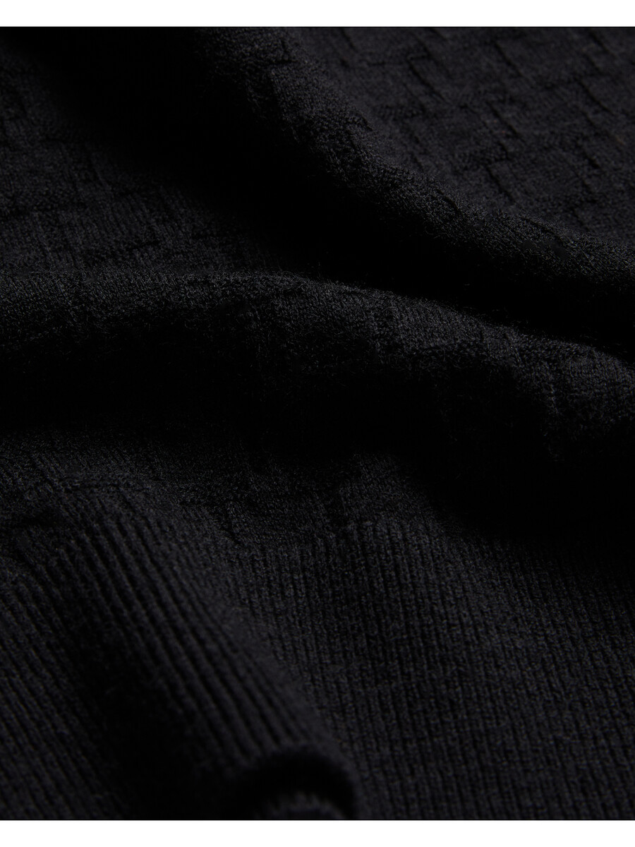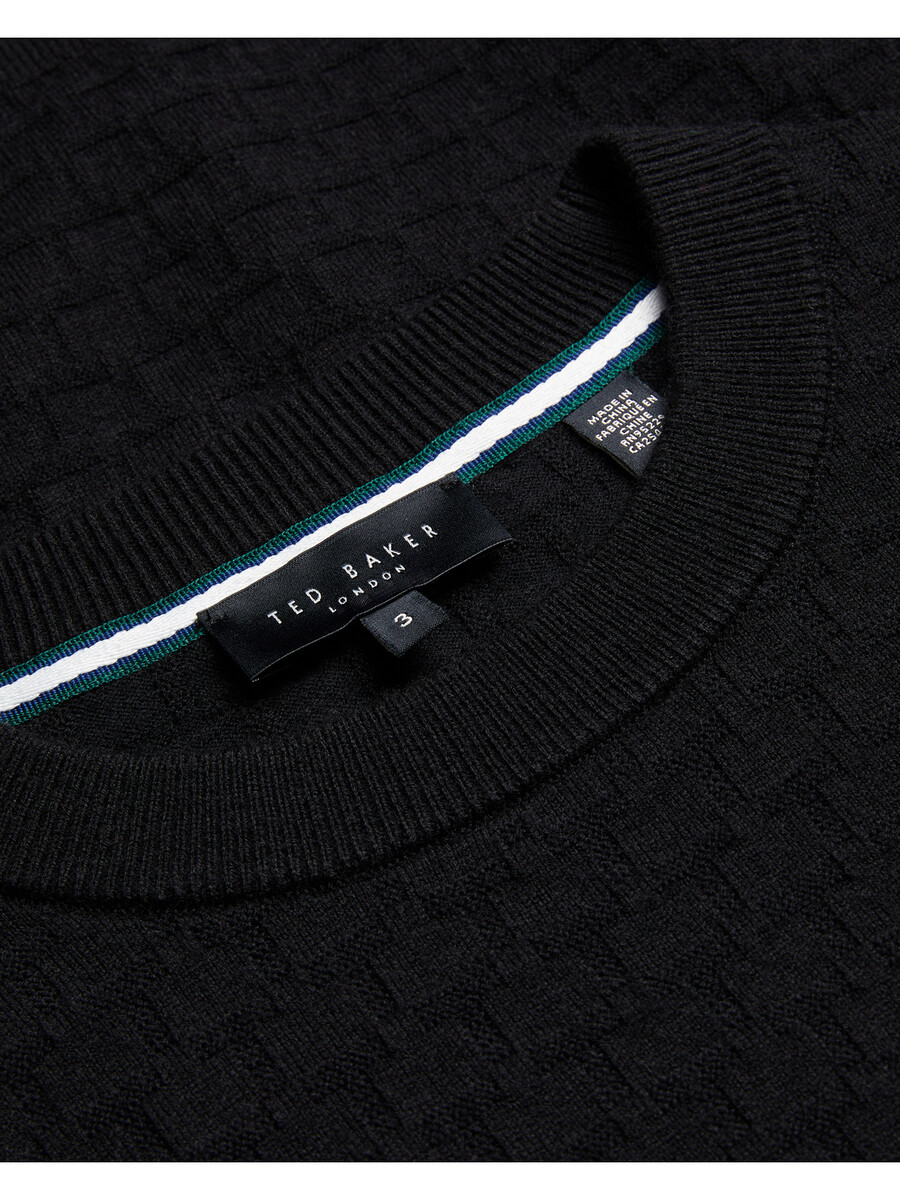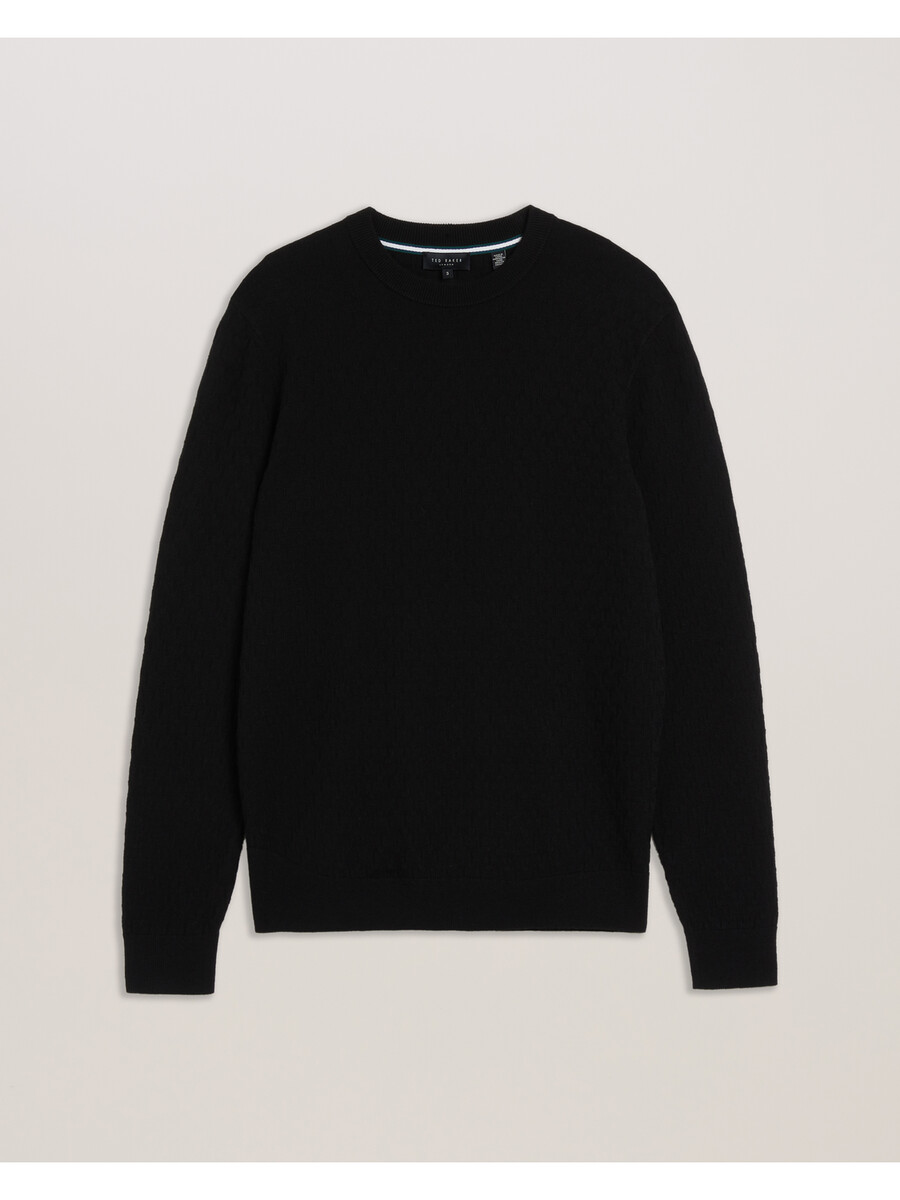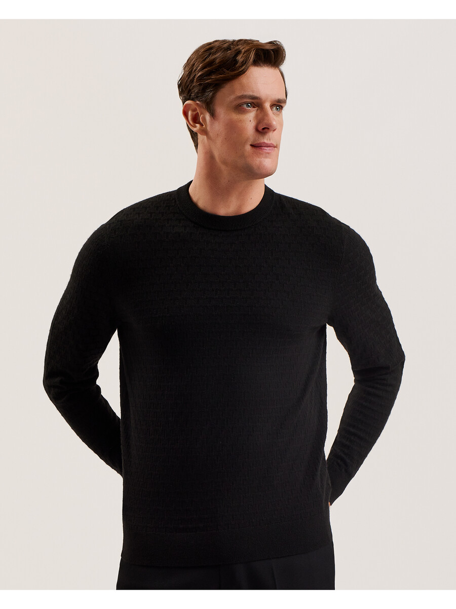 Jersey de manga larga Tejido de mezcla de lana Estampado de camiseta texturizado Cuello redondo Acabados acanalados Lewis mide 1,88 m y viste de negro en talla 3 de Ted 32 % poliéster, 31 % poliamida, 28 % acrílico, 7 % lana, 2 % elastano Lavar a máquina a 30 °C, no lavar en seco