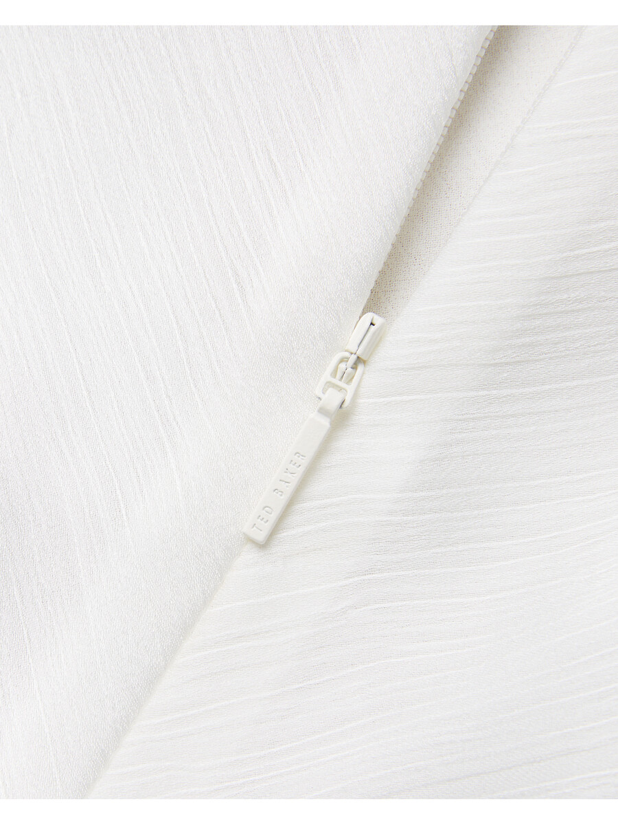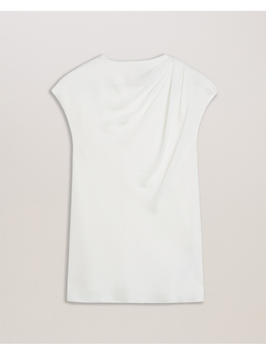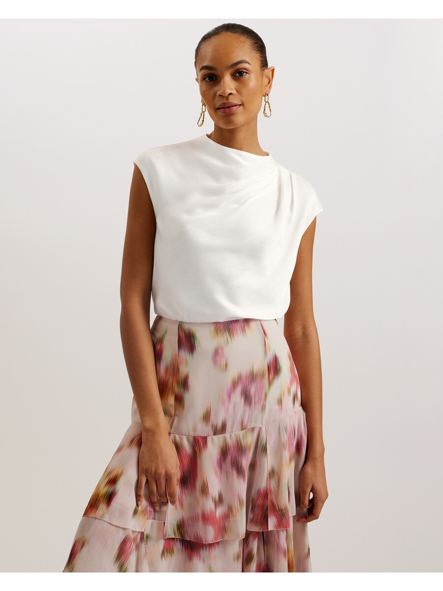 Blusa de satén Escote alto drapeado Detalle de hombros fruncidos Textura arrugada Mangas cortas Corte recto Cierre de cremallera oculta Stephanie mide 1,74 m y usa Ivory en talla 1 de Ted Exterior: 100 % poliéster; Forro: 100 % poliéster Lavar a mano con plancha de 1 punto Limpieza en seco con P